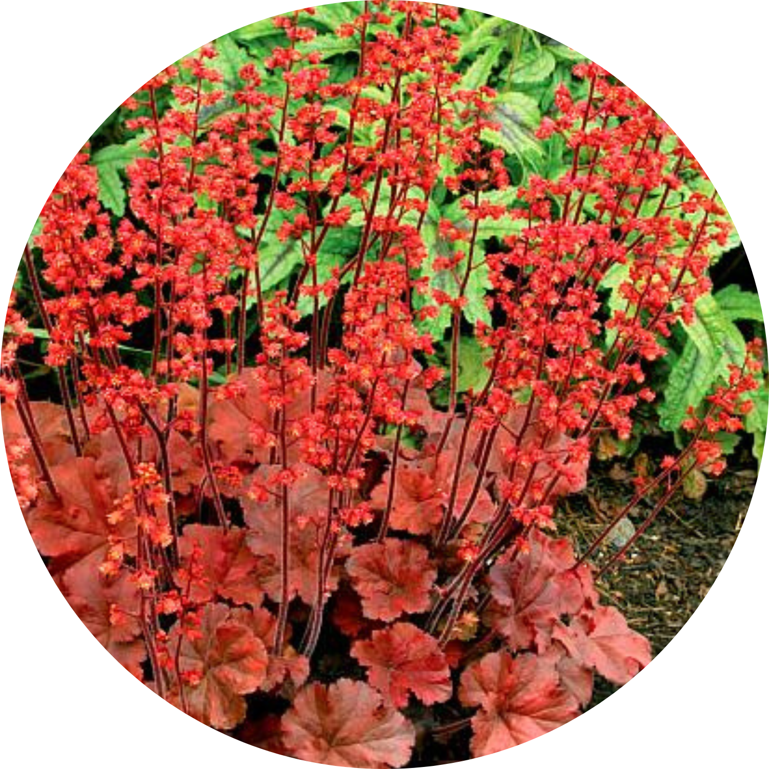 Coral Bells ‘Cherry Cola’ is a compact, evergreen Heuchera celebrated for its warm-toned foliage and vibrant floral display.