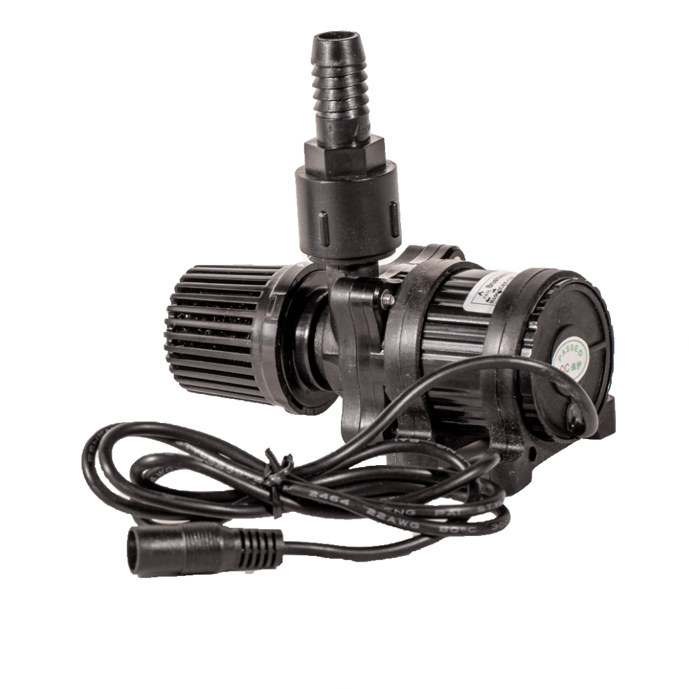 High-powered DC Brushless Pump with filter and 3 meters of lift. 12 Volt DC power adapter wall plug-in, 1/2" PVC connects the pump to irrigation assembly.