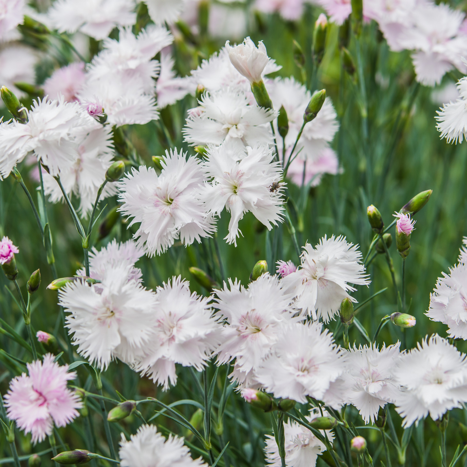Diana White Dianthus (Dianthus 'Diana White') is the ultimate choice for a crisp, clean garden aesthetic. This variety is celebrated for its oversized, single flowers in a pure, snow-white that practically glows in the moonlight. Each petal features a delicately serrated edge, giving the blooms a refined, lace-like appearance. Part of the Diana series, it is bred for early flowering and a very uniform, compact habit that stays lush and green.