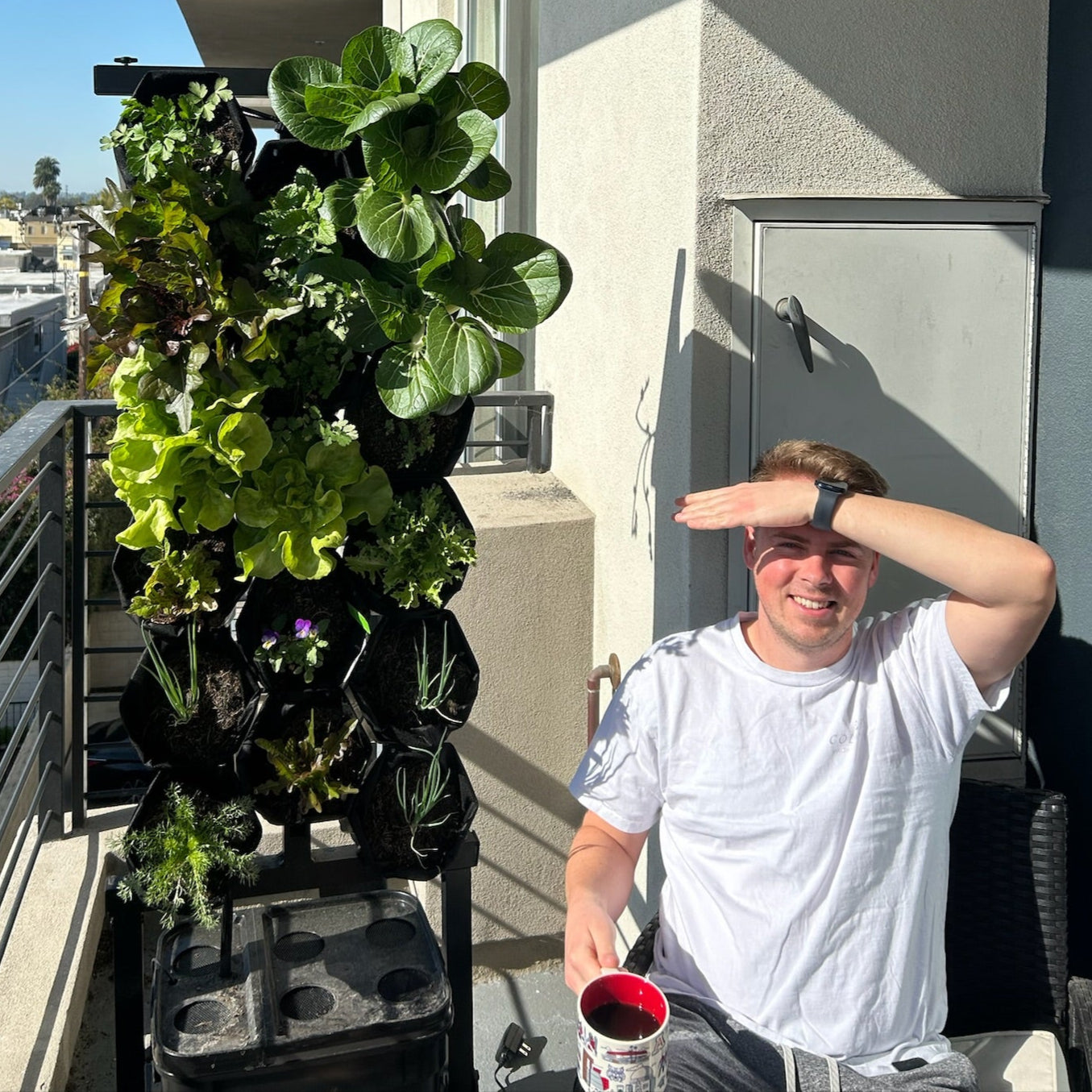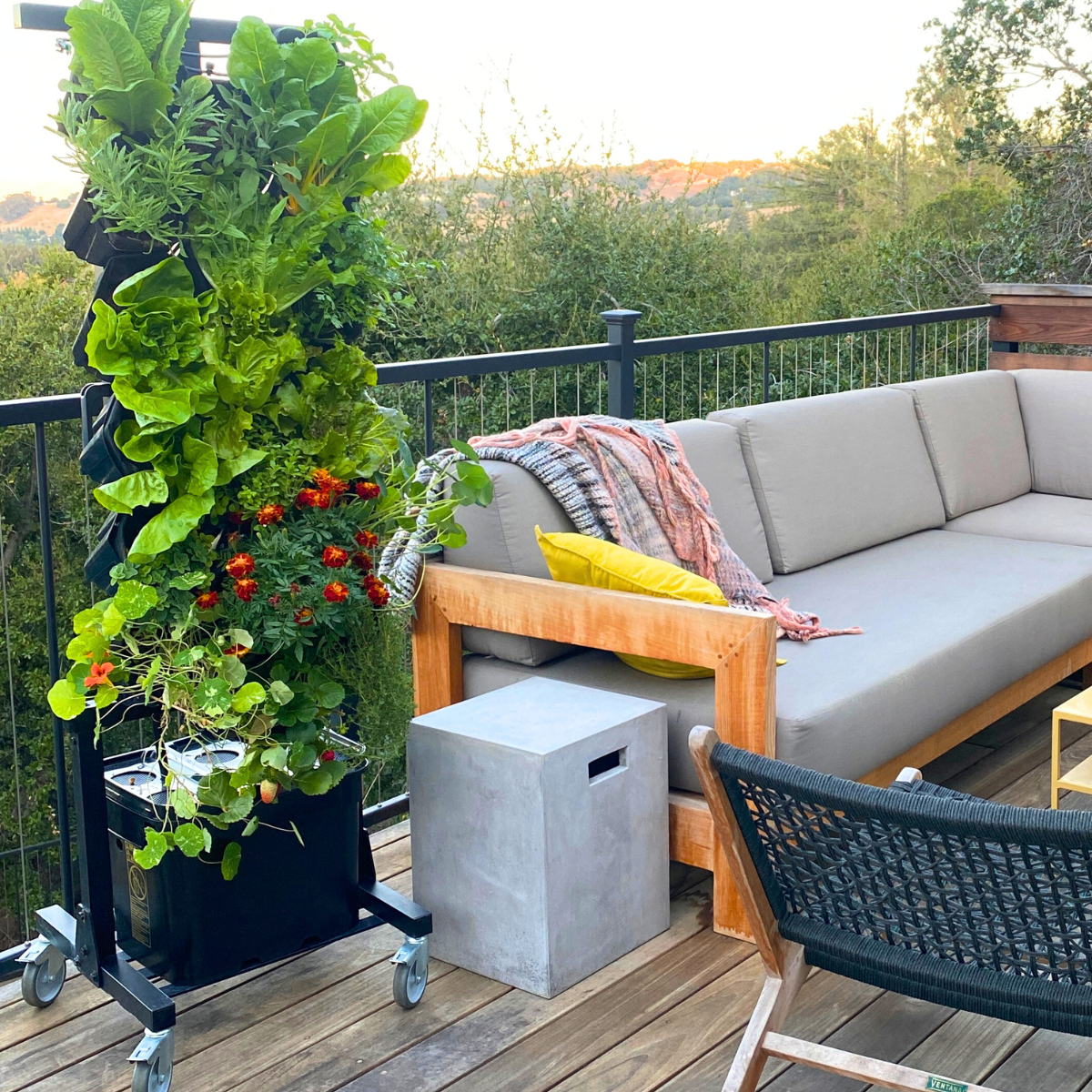 The Planted Wall is designed for tight outdoor spaces. Think balconies, patios and decks. At only 2ft by 2ft, it takes up about the same space as a person standing. For optimal results, you'll want to find a spot that gets at least 4-6 hours of direct sunlight a day, but you'll still see results with less. The lockable wheels make it easy to move around so you can try out different locations as you please.