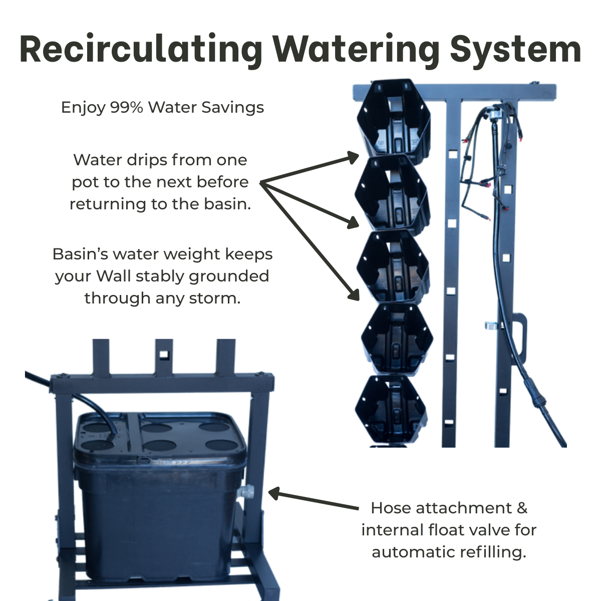Let's start with the water bill. You use 99% less water when you grow on the Planted Wall using the recirculating watering system versus a raised garden bed with a drip system.