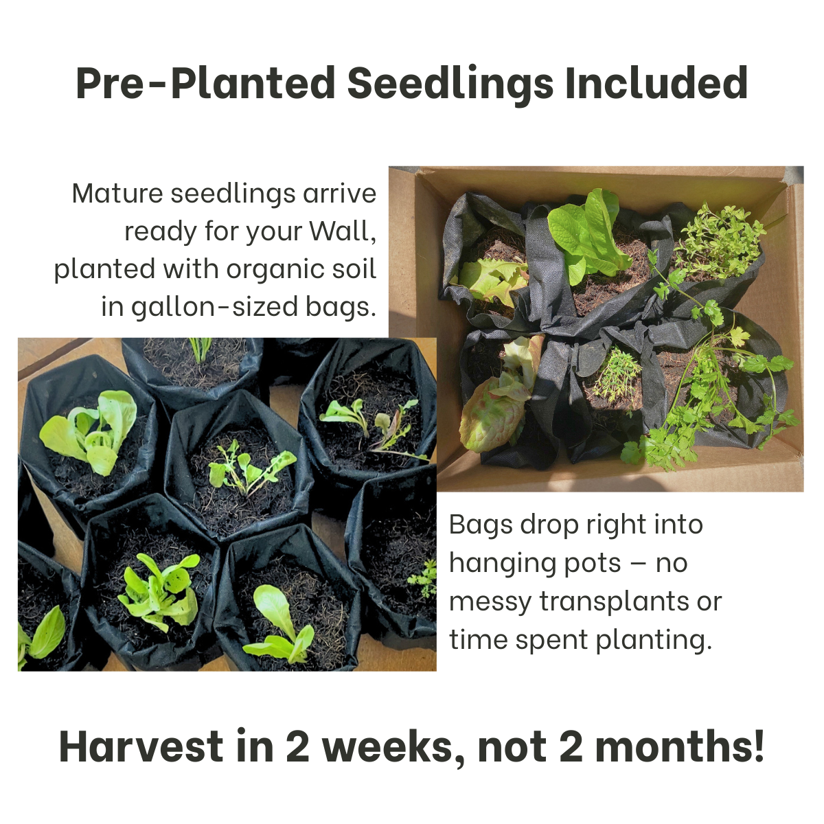 We plant your organic-certified seedlings in our organic-certified soil (rich with biochar, worm castings, and marine-based organic matter) before shipping so you don't have to. Simply pop them into your Wall and watch them grow!